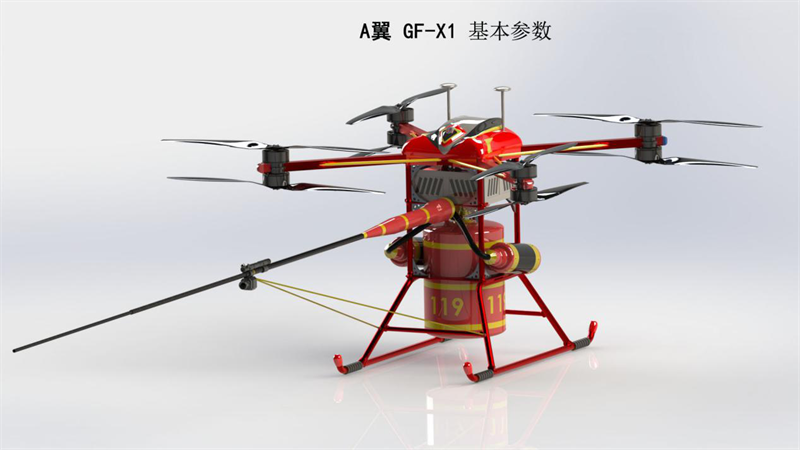 国飞通用航空的这台无人机可根据火灾情况不同,搭载的灭火材料也会有所不同。而这种无人机的首要条件就是大载荷,能够将重量较大的灭火材料带到高楼位置进行灭火工作,对这台无人机的负载能力是一个极大的考验。