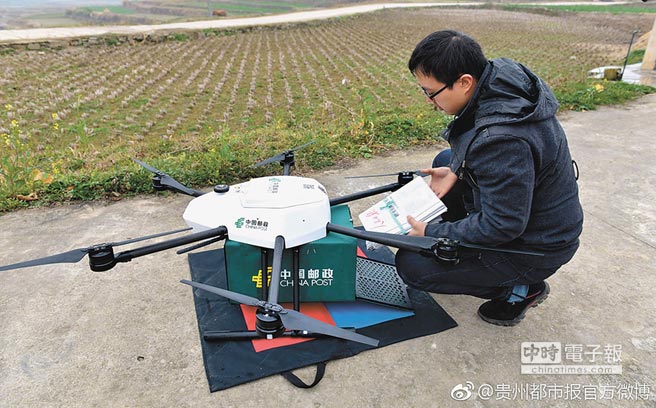 贵州贵阳卫城镇因位在山中,山路崎岖,每次邮差送件都要花一天,今年1月起,当地引入无人机协助送件。虽然无人机多由邮差驾驶,但只要装上电池,扫QR Code后,飞机就会按预定路程送件。