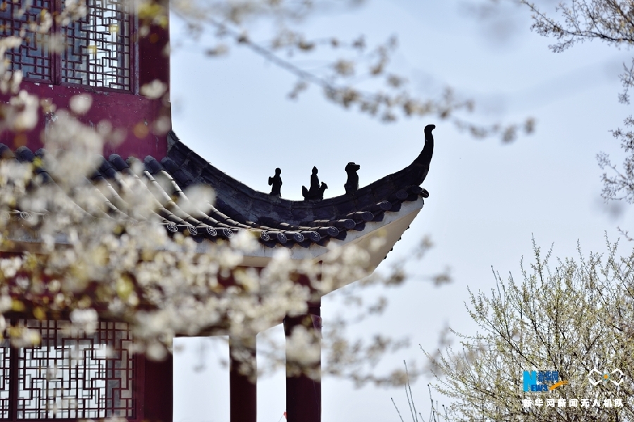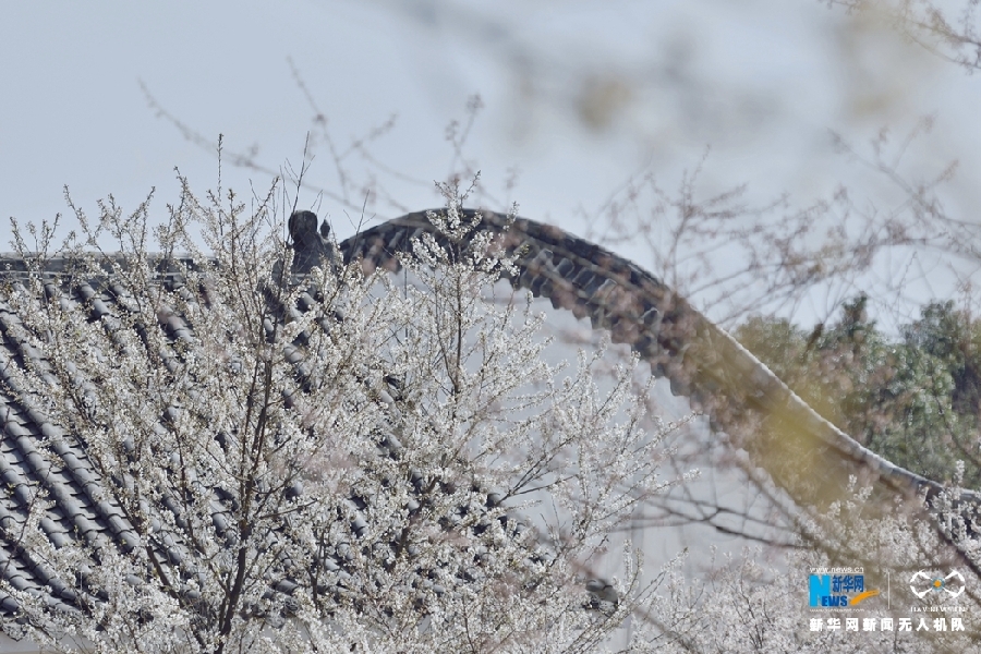 图为重庆市渝北区大盛镇云龟山樱花绽放墙头,与古建筑相互映衬。新华网发(傅杰 摄)