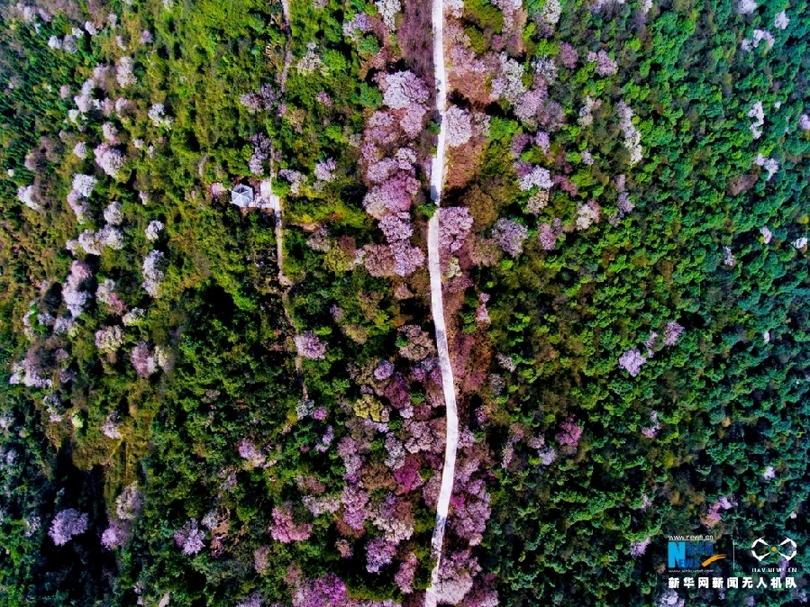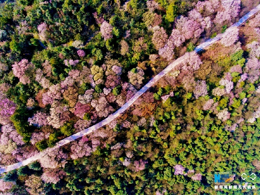 图为无人机航拍云龟山绽放的野樱花。观赏道两旁的野樱花铺设出一条赏花踏青之路。新华网发(傅杰 摄)