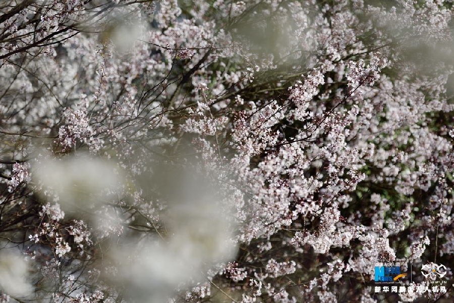 图为无人机航拍重庆市渝北区大盛镇云龟山万亩野樱花正逐渐绽放。新华网发(傅杰 摄)