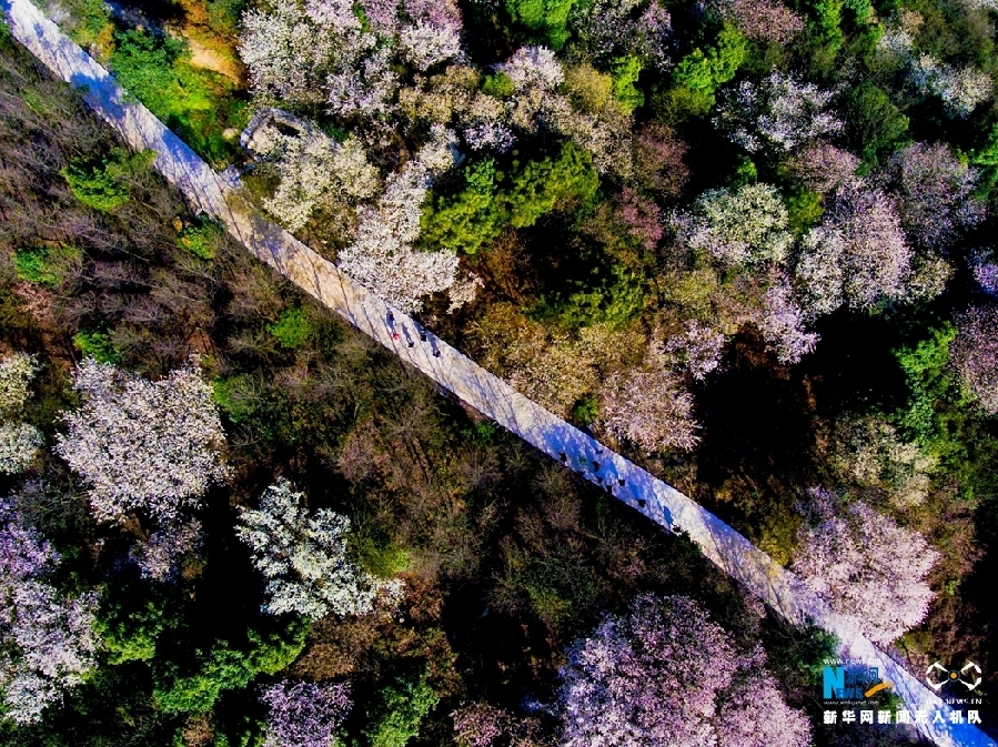 图为无人机航拍云龟山绽放的野樱花。春日暖阳下,樱花的花影落在白色观赏道上,别有一番诗意。新华网发(傅杰 摄)