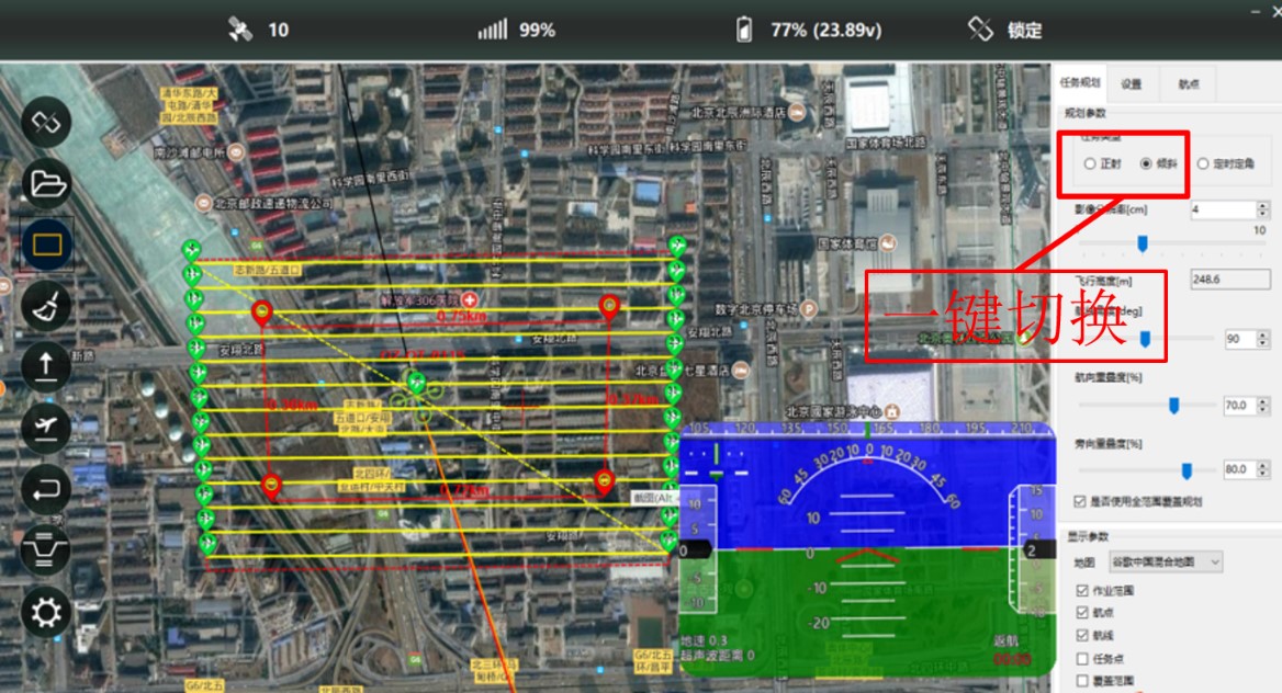 该设备不仅能进行倾斜摄影数据采集,同时可实现常规的正射影像数据采集工作,支持双系统作业模式。用于任务规划以及作业监控的地面站可以实现一键切换正射、倾斜摄影两种工作模式,方便操作。用户进行两种数据采集时无须携带两套不同的航摄设备,也不需要维护两个作业团队,一架作业顶两架。