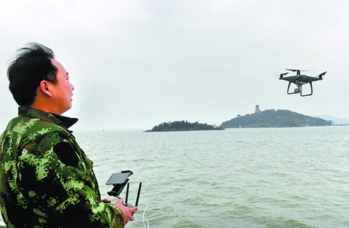 昨天,滨湖渔政执法人员操作无人机在太湖水面上巡航。为提升渔政执法效率,滨湖区在全市渔政执法中率先引入无人机,对太湖水域开展大范围、全天候巡航监管,打击偷捕等违法行为,更好地保护太湖渔业资源,促进水生态系统的相对平衡。