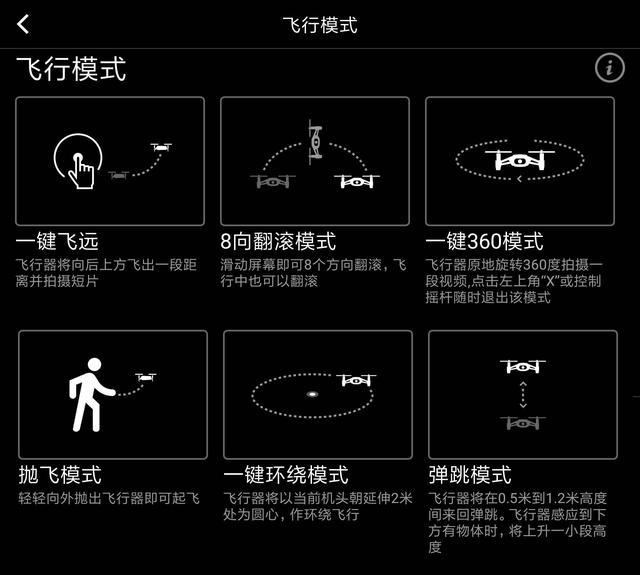 另外还提供提供了抛飞模式、翻滚模式、一键飞远、8向翻滚模式、一键环绕模式、一键360模式,使用过程中只需一键就可以完成高难度飞行动作,在增加趣味性的基础上大大降低了用户的操作难度。