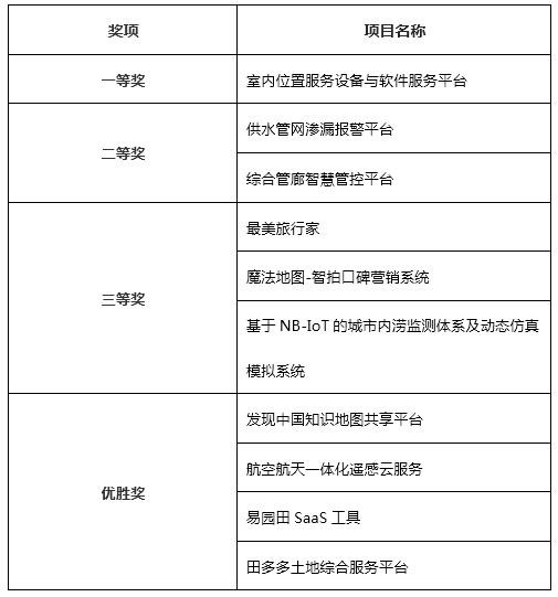本次总决赛评委由南京大学教授李满春、中国测绘地理信息学会副秘书长范京生、北京大学教授杜世宏、Esri中国信息技术有限公司副总裁沙志友、知卓资本副总裁王世超、中国农业科学院研究员毛克彪、中科院地理科学与资源研究所研究员秦承志担任。经过参赛小组现场路演,以及多位评委现场点评打分之后,武汉大学“无人机3.0-智能人机交互新时代”项目和苏州寻息“室内位置服务设备与软件服务平台”项目分别获得学生组和企业组的第一名。