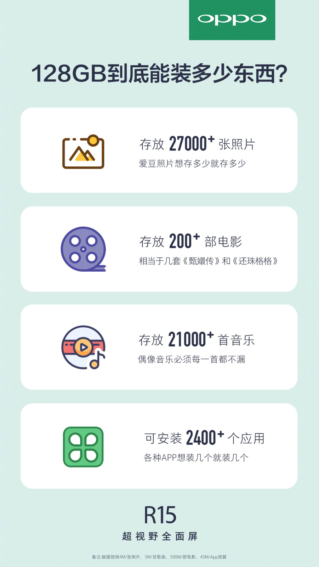 在硬件配置上,R15也迎来了非常重大的升级,标配6GB+128GB大内存组合,标准版搭载MTK P60处理器和支持VOOC闪充的3450mAh电池,而梦境版则搭载高通骁龙660AIE处理器以及3400mAh电池,并搭载智选双摄功能。有了大内存的加持,OPPO R15能够让手机轻松运行更多APP,告别卡顿享受流畅体验。同时还可以无所顾忌畅快拍照看电影听音乐,装下你所爱的一切。