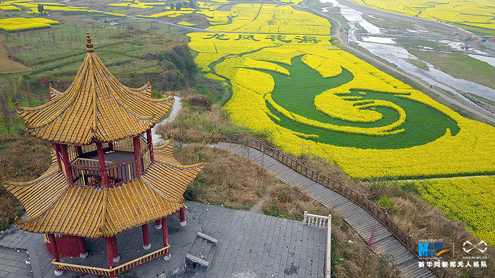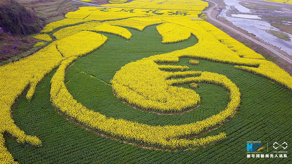 重庆秀山龙凤花海景区万亩油菜花近日依次开放,如同金黄地毯铺满大地。图为景区内用小麦和油菜花套种的龙凤呈祥图案。新华网 赵紫东 摄