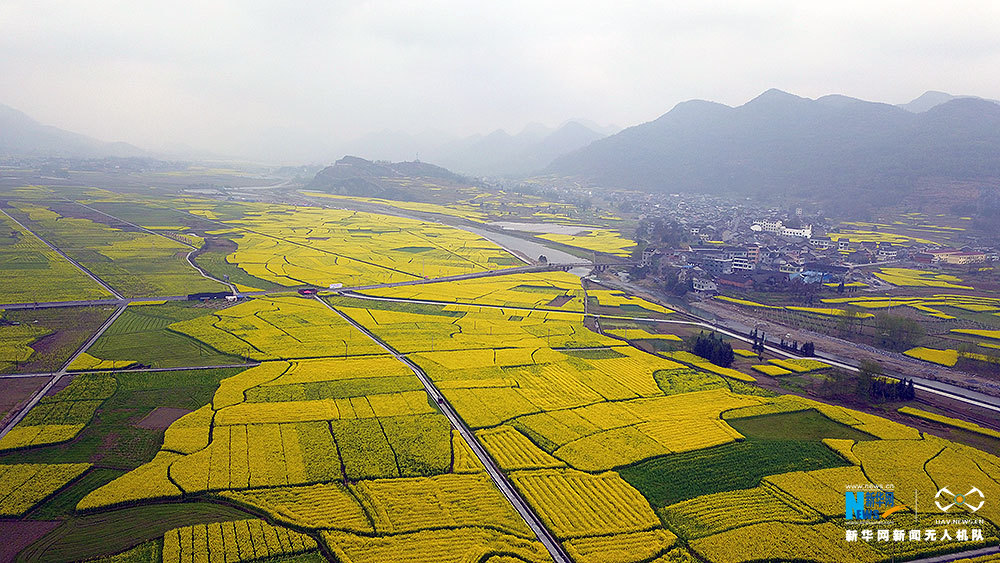 景区内今年共种植了3万亩油菜花,放眼望去,满目都是金黄色的油菜花。新华网 赵紫东 摄
