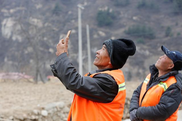 平石头村的村民拿出手机拍摄京东无人机试飞场景。