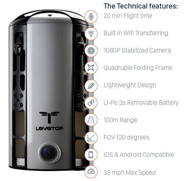 LeveTop 其实是一款智能折叠无人机。它是你能在天空中遨游 20 分钟第三只眼;它是你可以随身携带的一个小杯子;它是你日常冒险的 1080P 稳定照相机。