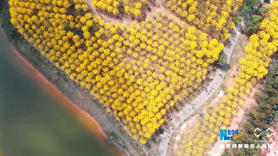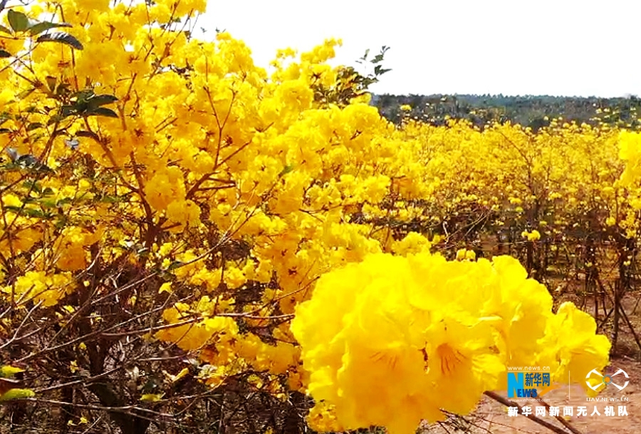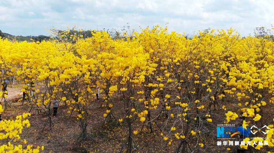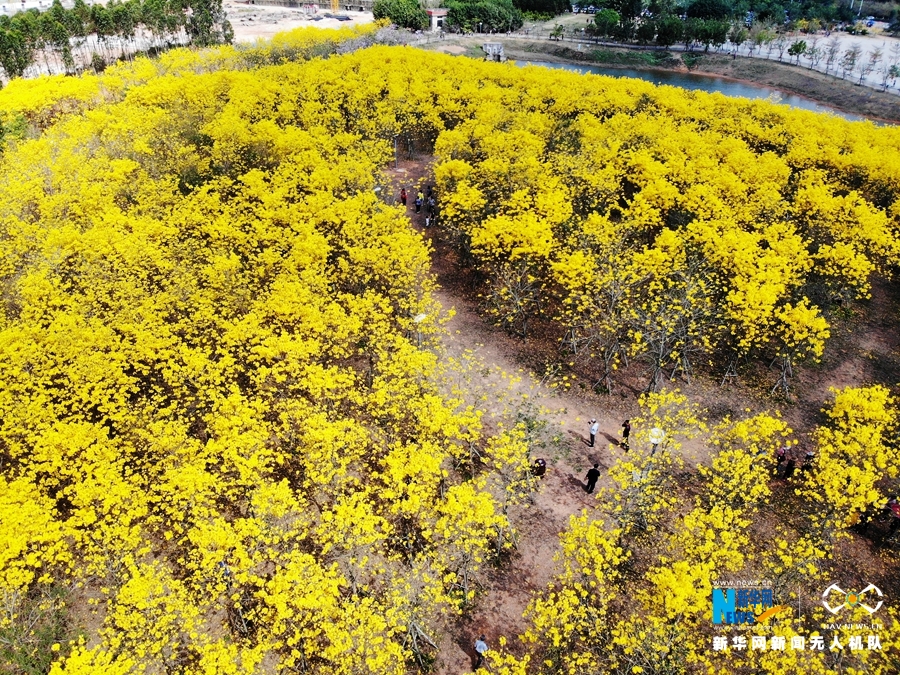 风铃木迎春怒放,微风拂过,金浪涌动。新华网发(梁必成摄)