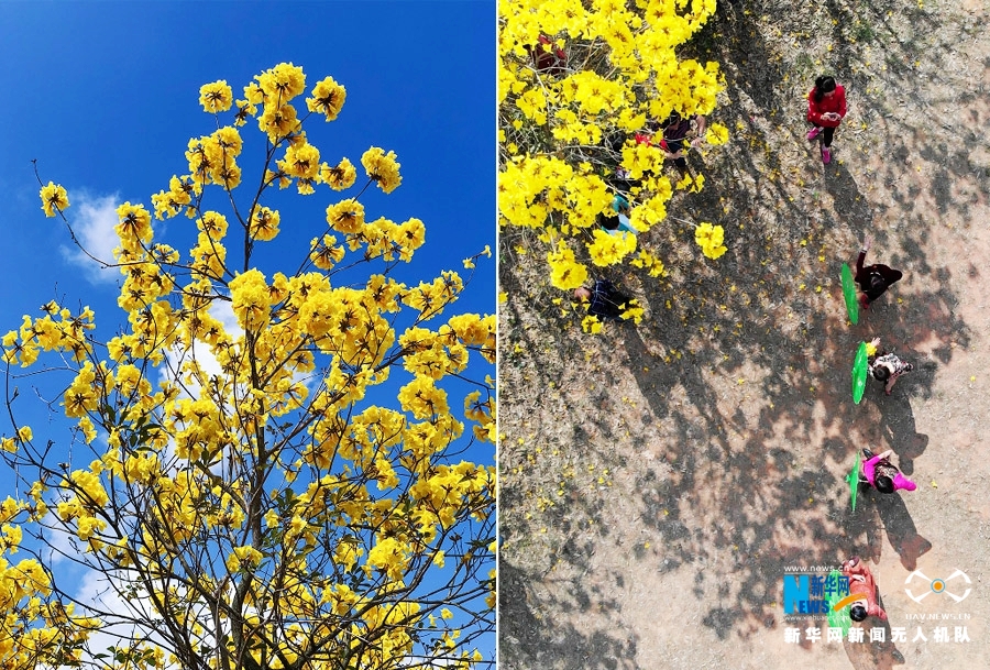 左图:金色的黄花风铃木与蓝天白云相互映衬。右图:航拍人在花中走,犹如画中游。(拼版图)新华网发(梁必成摄)