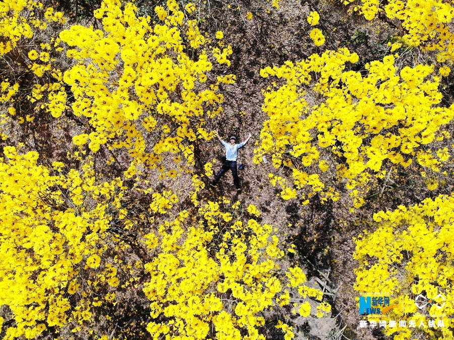 俯瞰风铃木花海犹如大地调色板。新华网发(梁必成摄)