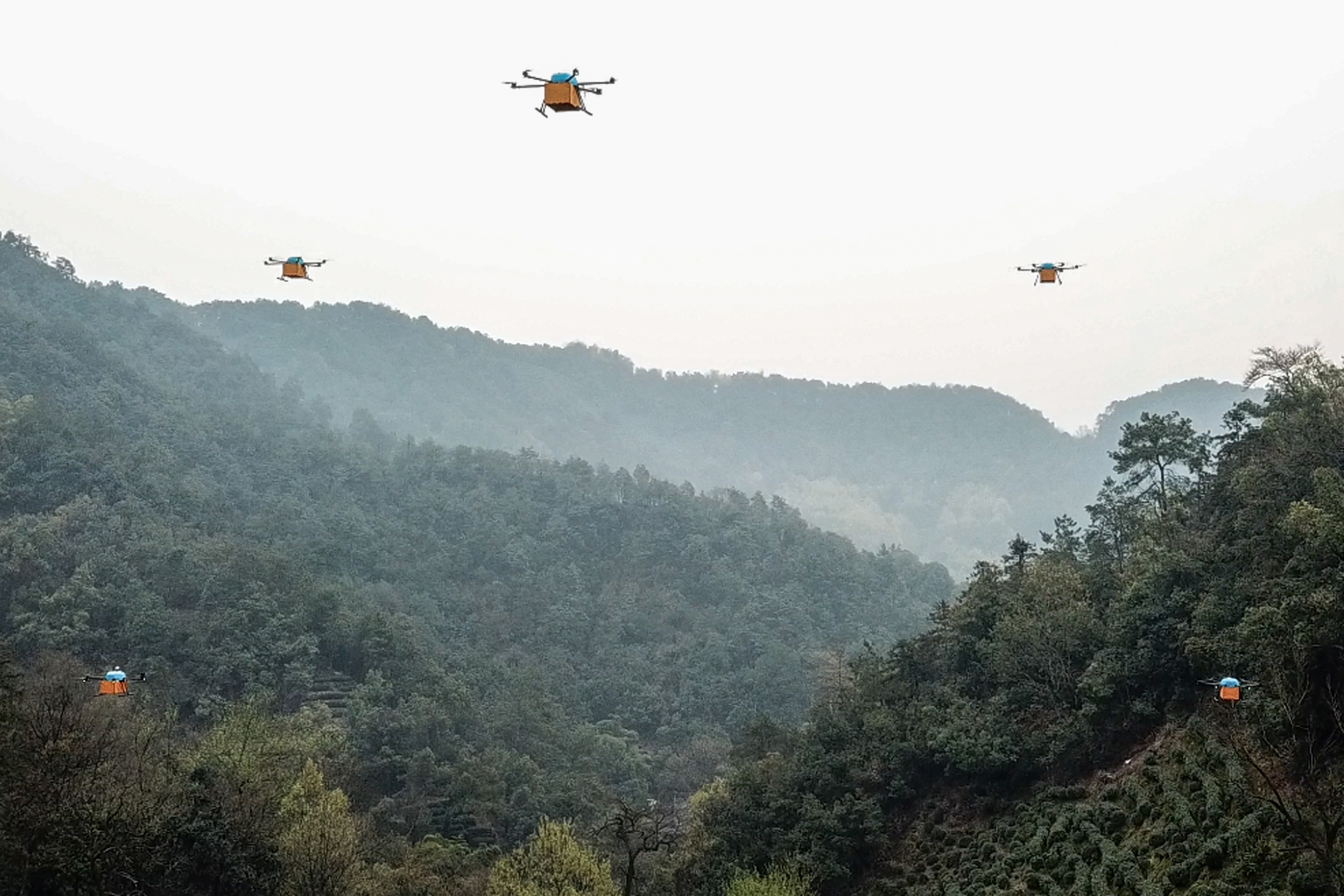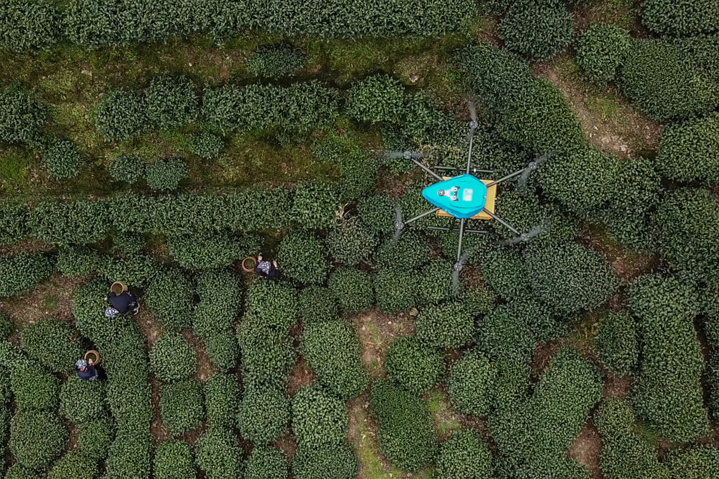 今年狮山龙井的第一采,是由菜鸟无人机运送下山的,时间不到2分钟。而通过传统采茶工人工运送的方式,通常要一个小时。