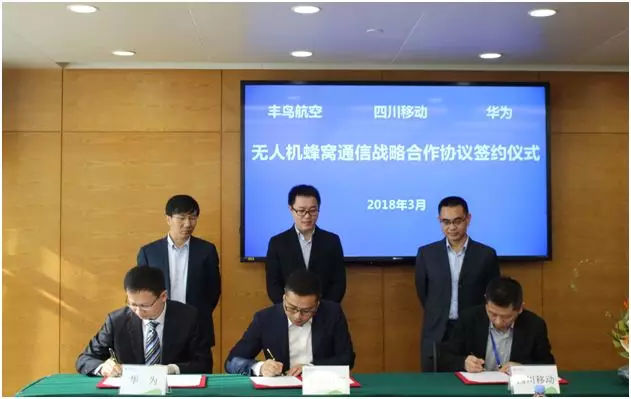 2018年3月26日,华为与中国移动通信集团四川有限公司、顺丰集团旗下丰鸟航空科技有限公司签署战略合作备忘录(MOU),致力于下一代移动通信技术与物流无人机应用相结合的跨产业联合创新,携手打造全球首个支线物流无人机蜂窝通信试验网络。