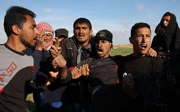 南加沙地带 Khan Yunis 市在 3 月 16 日爆发示威。多名巴勒斯坦男子将受伤示威者抬离现场。