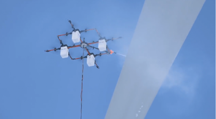 而在视频中可以看到一架无人机正在除去风力涡轮机叶片上的雪和冰。该无人机配备了一条供水系绳,每分钟可喷射100升水,另一条供电,意味着它可以无限期地停留在高空。