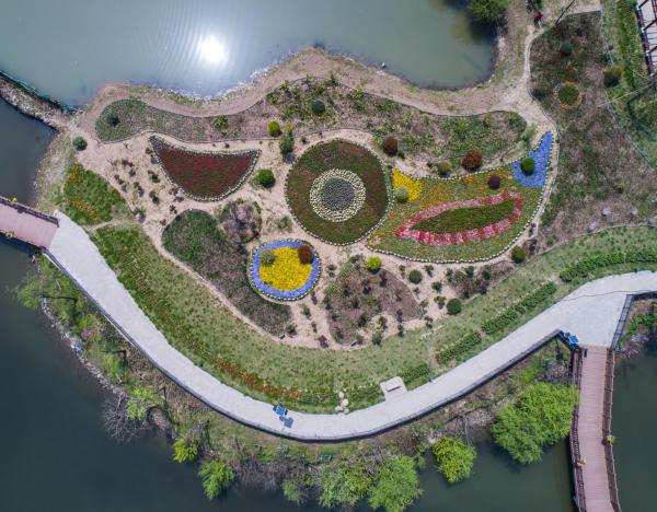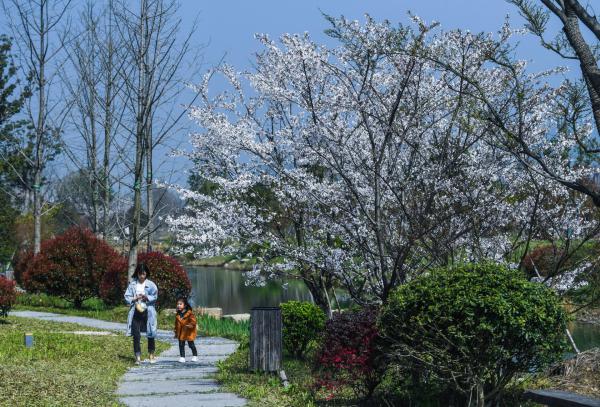 ↑3月27日,游客在余杭区县级美丽公路漕雅线边的景观带中游览。