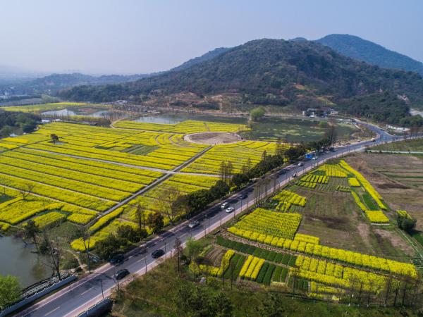 ↑这是3月27日使用无人机航拍的余杭区农村公路超山环线,道路两边油菜花盛开。