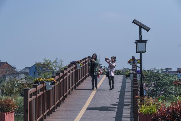 ↑3月27日,游客在游览余杭区乡村旅游步道塘超小径。