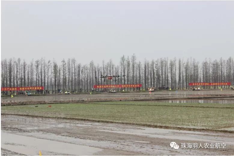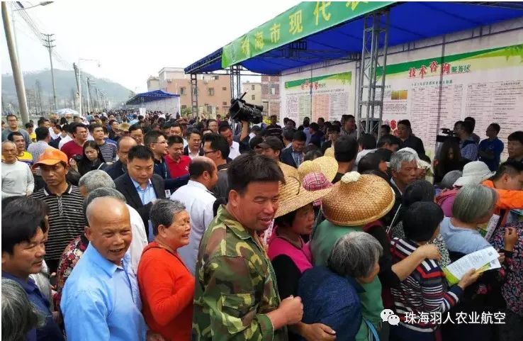 在新村农田边上,农产品及技术展示长廊人气聚集。现场见到,珠海羽人农用无人机在千亩示范基地上低空翱翔,完成插播前的备耕防虫作业。