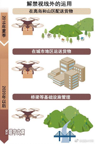 日本政府将首先在离岛和山区解禁视线外飞行,认为这将有助于加速无人机的商业利用。政府将修改基于《航空法》的许可和批准标准。要求使用无人机的企业和个人限定飞行场所,通过无人机的位置、高度和速度确保安全性。