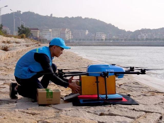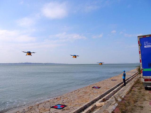 2017年“双十一”期间,阿里巴巴菜鸟网络的无人机群组飞跃海峡,为福建莆田市湄洲岛居民送货。