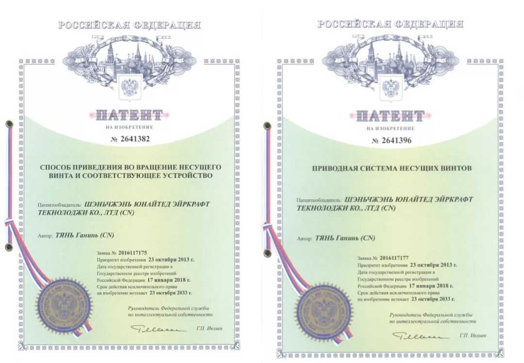 2018年1月17日,由深圳联合飞机科技有限公司(以下简称“联合飞机”)自主研发的“旋翼驱动系统”、“旋翼驱动方法及装置”获得2项俄罗斯国家发明专利。