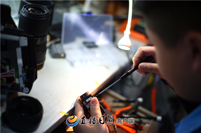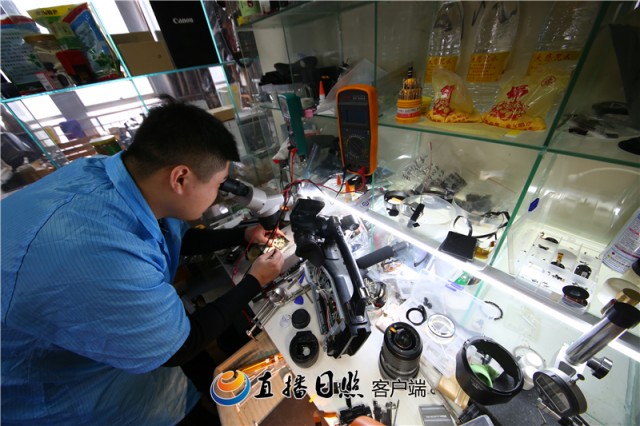 2018年3月20日,在海曲西路的一间写字楼里,90后农村小伙崔皓正在工作台上轻巧敏捷地修理相机镜头。他从2014年开始修数码相机,每年大约修理400套左右,如今技艺已经相当精湛。去年一年,崔晧修理的单反相机、无人机、稳定器等数码产品超过600台,年收入超过20万。