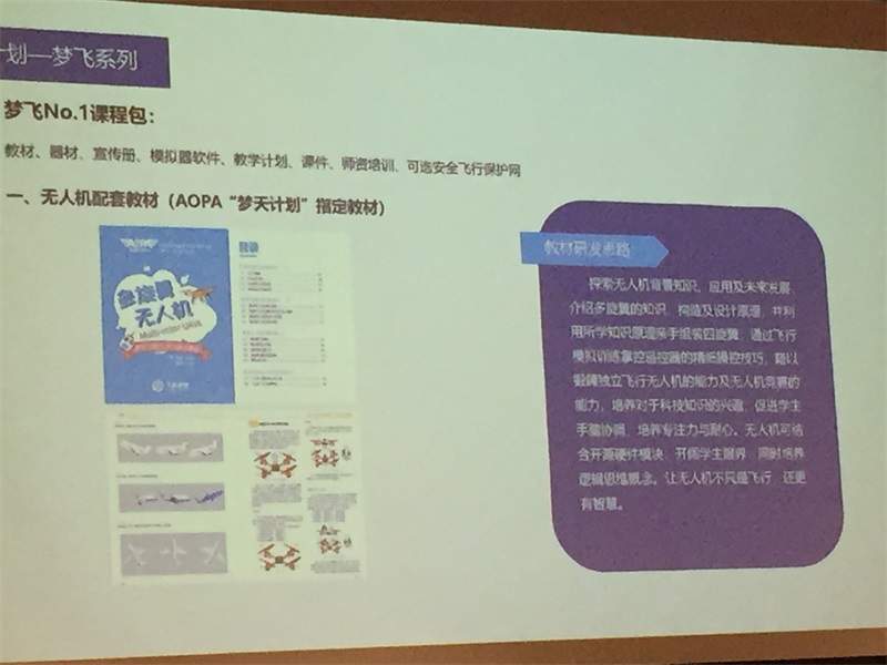接下来由武汉飞航科技有限公司总经理奚海蛟向我们介绍了“梦天计划”中的“梦飞”“梦创”课程包。这两个课程包是为了无人机专业知识教育量身定做的,秉承着“打开即教学”的方式,定制了“短、中、长期计划”,有众多种类的教材,教具。课程拓展方向“模拟飞行,体验飞行。”