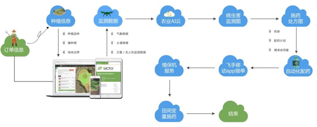 业务的模式是,麦飞先筛选订单。关注的维度有两方面:其一是作物的种类和播种期是否一致,以及农田的连片程度,如果更为集中可以节省监测和施药成本;其二是客户质量的把控。