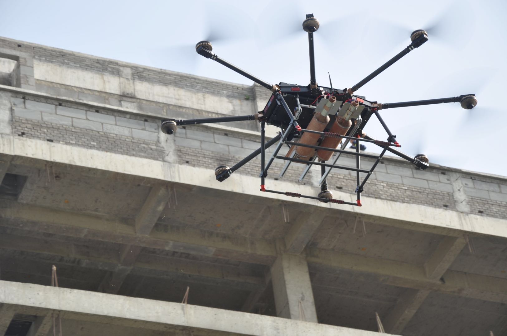 “天龙Ⅰ号”高层建筑专用消防灭火特种无人机平台具有20公斤挂载能力,可携带4枚灭火弹,在20米外发射,可穿破厚度达20毫米的双层钢化玻璃。一个架次飞行可抛射8公斤灭火剂,灭火覆盖能力80平方米。目前该无人机系统已获国家授权专利4项,还有2项已经受理。