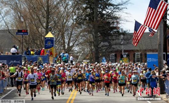资料图:当地时间2017年4月17日,第121届波士顿马拉松开赛,众多跑者参与。