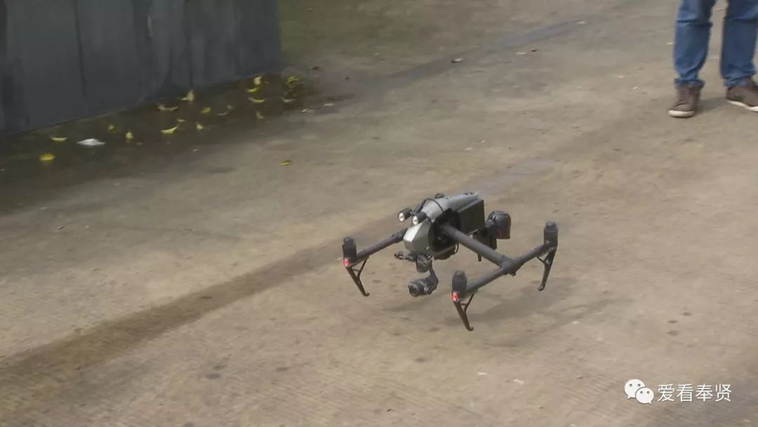 这架无人机,它有四个机翼,机身上有4个着陆起落架,在机身下方,装有可多角度旋转的4k高清摄像头。无人机采用微波传输的技术,由一位工作人员负责遥控,另一人负责在地面的微波图像基站进行实时监控,还有一位工作人员会和网格化指挥中心进行联系,随时接受指令。
