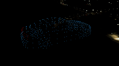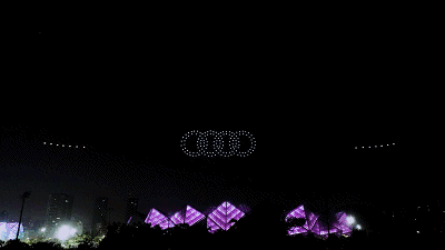 表演中,无人机编队多次变换阵型,并通过灯光明灭变换呈现丰富的视觉效果。其中二维平面最大表演面积为300*30㎡,无人机编队在描绘出华美的空中画作。而令人惊艳的3D汽车,体积达100*50*30m³之巨,造型中还精细地表现了车轮、前后车灯,无人机编队将奥迪A8L“描绘”如此宏大而又细致,在现场赢得了阵阵的惊呼和掌声,让人赞赏到无以复加。