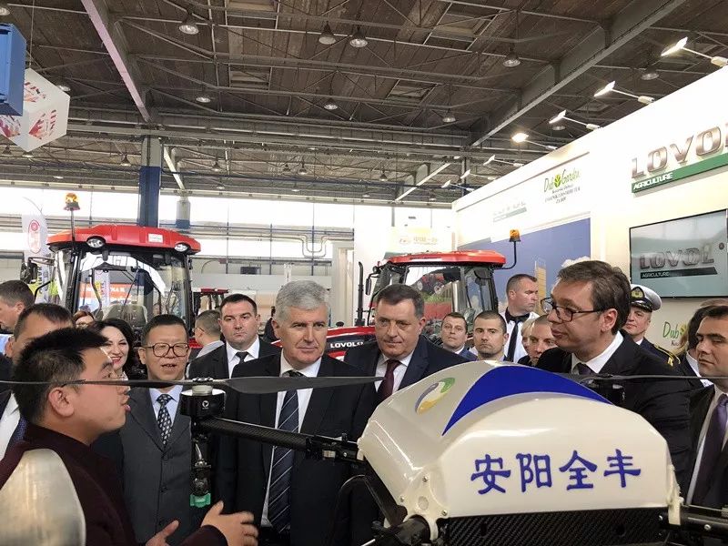 4月10日在波黑南部城市莫斯塔尔,全丰航空应邀参加“中国-中东欧国家合作16+1”农业装备和投资博览会——莫斯塔尔经贸博览会专场。期间,波黑主席团克罗地亚族成员乔维奇、部长会议副主席沙洛维奇,塞尔维亚总统武契奇等政要在我驻波黑大使陈波、中国-中东欧国家事务特别代表霍玉珍、贸促会促进部副巡视员周侗等陪同下参观了中国展区,其中以全丰航空自由鹰为代表的中国航空植保无人机给其留下深刻印象。波黑代表团衷心希望全丰航空能将先进的中国农业科技带入波黑,帮助波黑完成传统农业转型升级。