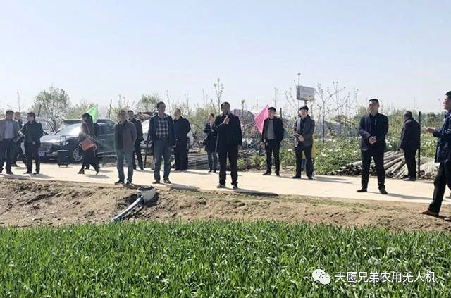 在九龙镇郭庄新村翠绿的麦田上,天鹰兄弟多架无人机同时喷洒,场面壮观,在场群众拍手称赞。