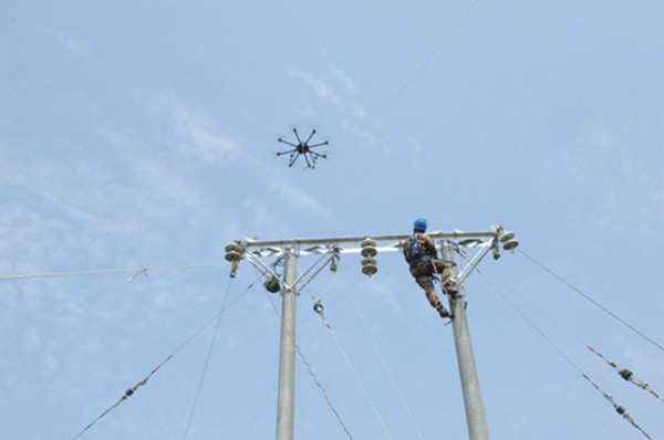 4月10日,在110千伏龙西线035#铁塔上空,一架无人机与带电作业工在高空协同实施春检作业。近年来,湖北十堰供电公司借助无人机“垂直俯视全方位、宽幅角度大视野”的视角优势与“机动灵活少限制、安全便捷省人力”的操作优势,创新应用于山区巡检、线路勘察、线路验收、防控山火等领域,提升电力勘测设计、运维检修水平。(郝金鑫 )