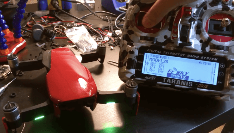 外观上来看,改装后的 Mavic Air 唯一不同的是,机顶加装了 FPV 相机镜头及一条伸了出来的天线。另原厂遥控器被抛弃了,改用专门的Taranis X9D Plus控制器,飞行员也配戴 Fat Shark FPV 眼镜来操控这台「Kiss Mavic Air」。