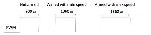 评估板使用ST-Link / V2编程器进行编程,可以使用ST电机控制工作台配置固件(有关使用MC工作台的简短视频介绍)。使用该软件和评估板,工程师可以分析电机并编译驱动该电机所需的固件。当用于驱动电机每相的信号由电路板计算并应用时,将使用PWM信号来设置电机的速度。如图4所示,1060μs和1860μs之间的脉冲分别用于将电机速度设置为最小值和最大值之间。