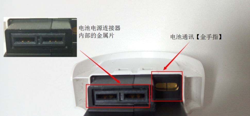 查看电池电源连接器内部的金属片(见上图)破损情况,如果金属片表面烧损比较严重,建议用厚度在1mm 以内的细砂纸插入连接器内部轻轻打磨金属表面。