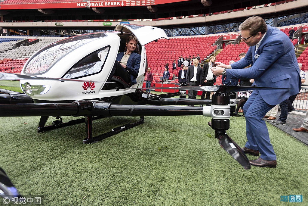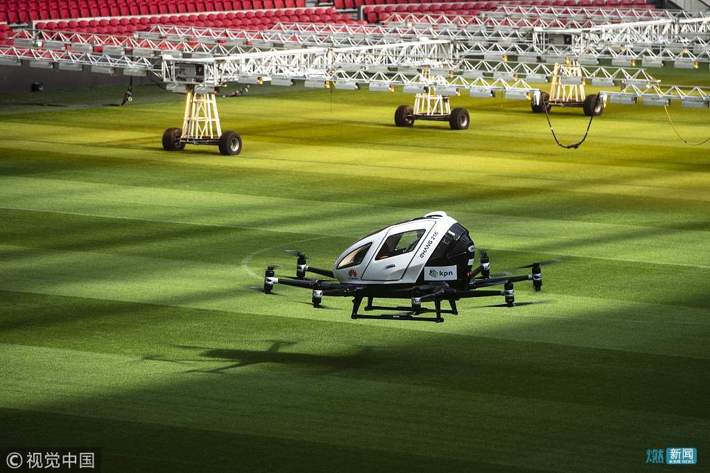 当地时间2018年4月16日,荷兰阿姆斯特丹,一架无人机出租车进行试飞,能容纳两人和一件小行李,载重可达210公斤。