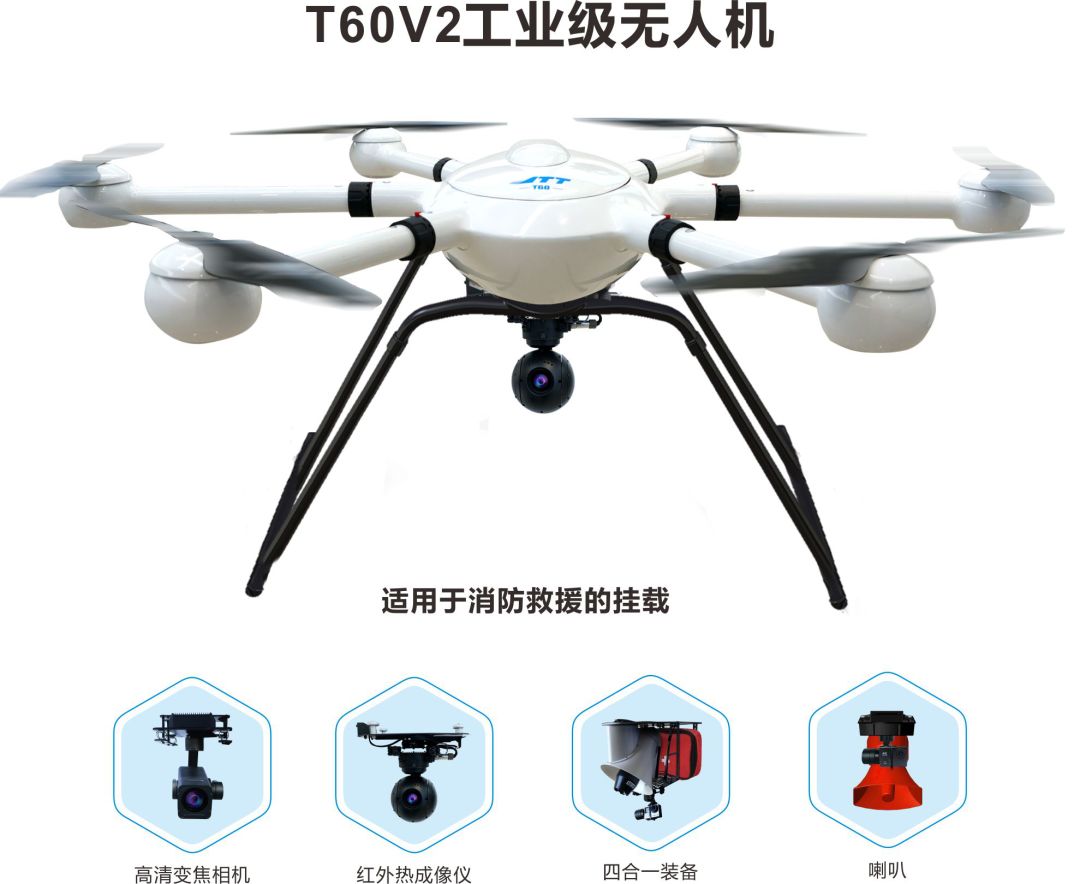 智璟科技T60V2工业级无人机可配备全高清无线视频传输系统,其传输距离可高达20公里以上,并支持多点接收。同时在搜救的过程中智璟科技T60V2工业级无人机搭载30倍高清变焦相机,可高空远距离识别搜救对象,成像清晰。搭载红外热成像通过物体热辐射的红外线特定波段信号转换成可识别的图像和图形,可以检测到隐藏在隐蔽处的搜救对象和火灾中的着火点。在搭载四合一挂载的时候可以在出现意外的情况下空头应急使用的救援物品,和对受伤人员进行喊话安抚。T60V2工业级无人机搭配不同的挂载,体现出超强的能力,能很好的配合地面人员完成任务。