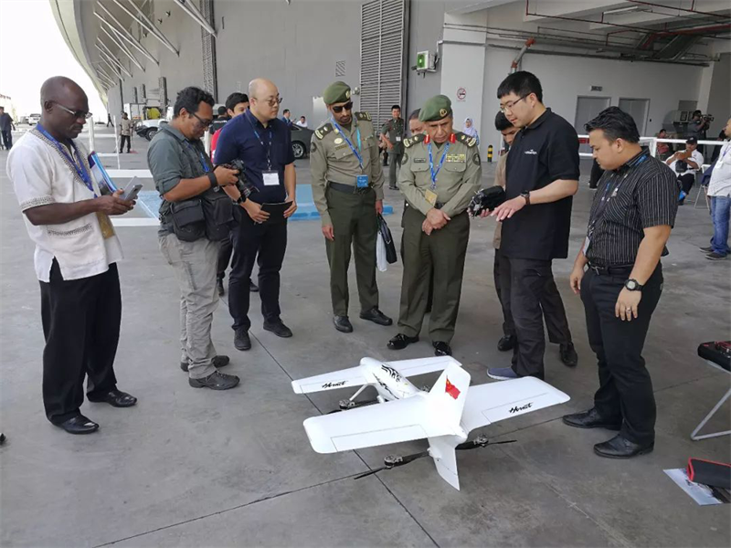 展会期间,无距科技重点展示了“辽”矢量多旋翼无人机、“无距”串列翼倾转旋翼无人机两款产品,同时推出警用安防领域解决方案。无距科技海外事业部BP崔经理向媒体介绍:我们这套无人机系统,使用自主研发的飞控系统,实现了全向倾转,目前是世界上唯一能实现全向倾转的矢量多旋翼无人机飞行平台。这次我们带来的产品是飞行平台加上多任务载荷的五光吊舱,具备日间夜间多倍变焦、红外切换、夜间星光补偿照明等多重影像采集能力。结合我们配套的一体化三防式地面站系统,可以实现缉毒侦查、警务联防、日常警务巡逻等多项安防应用。同时也可以配合军方实现前期的军事侦察、民警巡逻等联合任务。利用我们自主研发的一体化地面站操作系统,客户无需过多的飞行经验,即可进行常规的飞行任务规划、日常任务巡逻、指定任务作业、指定飞行地点取证等飞行任务。