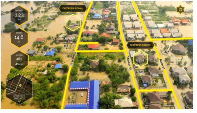紧急救灾阶段通过无人机传回的图像,指挥人员能看到每一个救援人员的确切位置,以便跟踪最新的救灾状况。