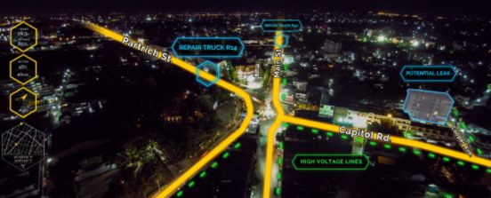 功能包括一个带有地理信息层的无人机视频传输,帮助急救人员在第一时间通过无人机飞到高处,看到完整的地面信息。图上的AR辅助内容包括街道名称(会用黄线标注)建筑布局以及其他的标记数据。