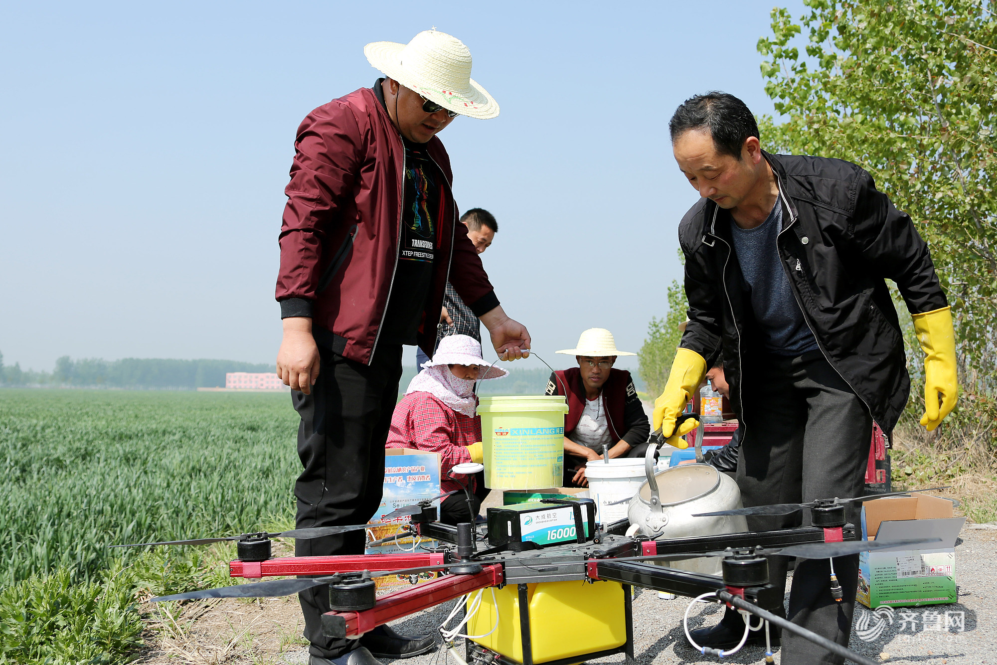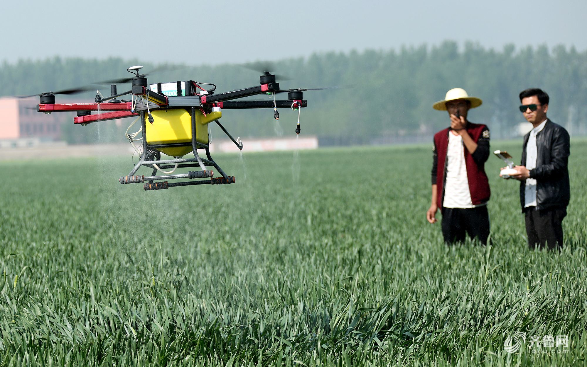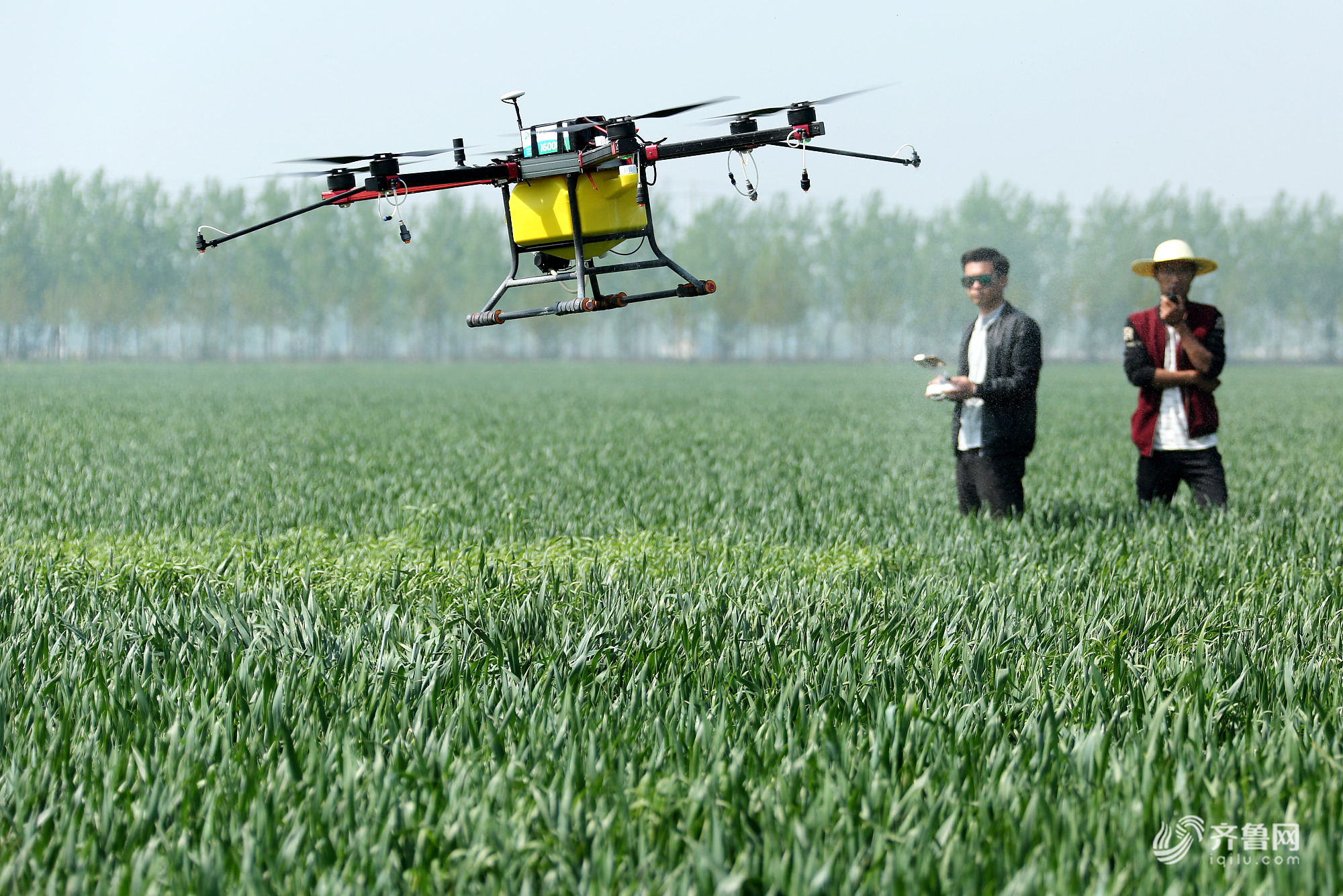 2018年4月20日,在山东省枣庄市古邵镇大刘庄村麦田里,刘永亮租赁的植保无人机在免费给贫困户种植的小麦喷施富硒叶面肥。