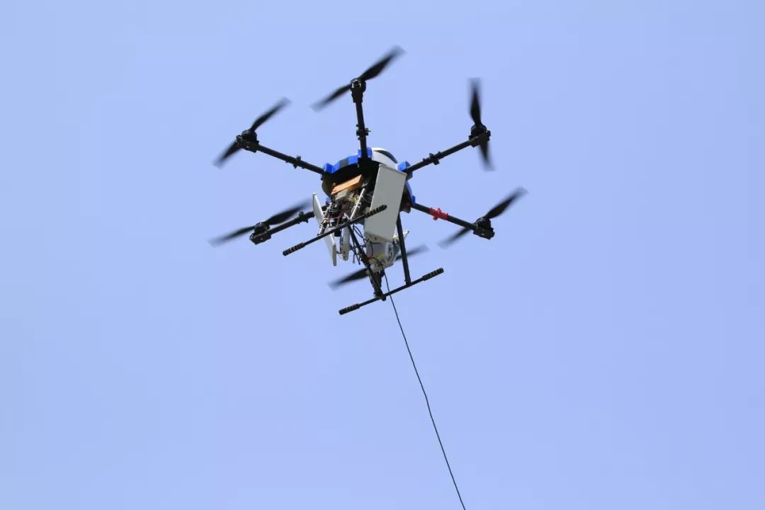 我是系留式无人机,我飞上天后,可以实现周边15公里范围的无线信号覆盖,同时还可以搭载其他负载,实现高空照明、空中定点监视、远距离通信中继等功能。我的特点是留空时间长,载重量大、线缆约束安全性高,搭载小型化基站实现无线信号覆盖。相比应急通信车,我能从空中实现覆盖,无遮挡,信号效果更好。
