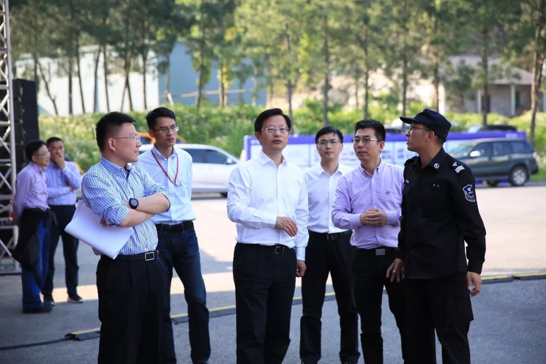 中国电信浙江公司总经理韩臻聪(左三)、副总经理陈华(左一)检查应急通信演练预演情况。